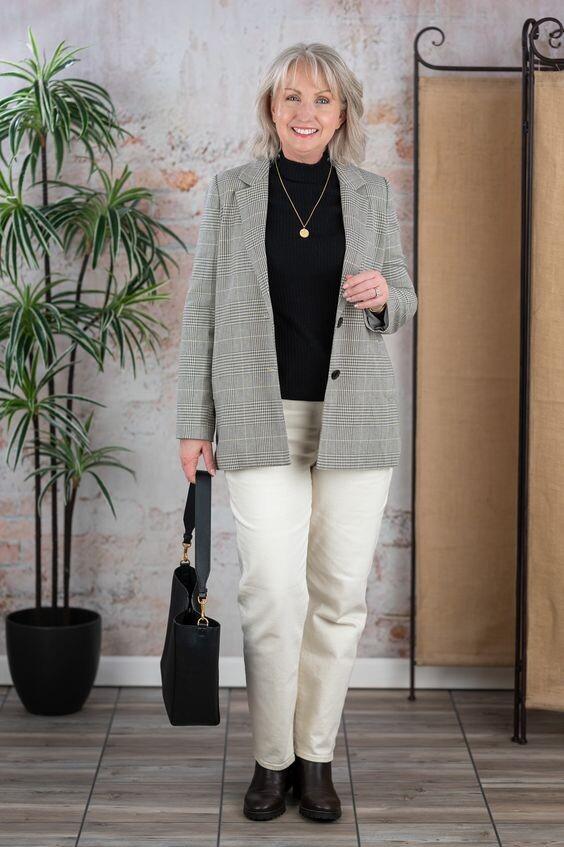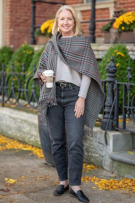 Для создания такого уютного осеннего образа женщине 60 лет и старше потребуются самые простые вещи. Это темные прямые джинсы с эффектом потертости, серая водолазка и палантин в мелкую клетку. Образ получается оригинальным и стильным.