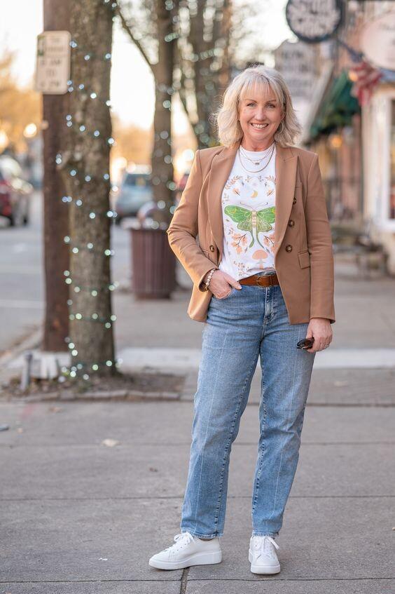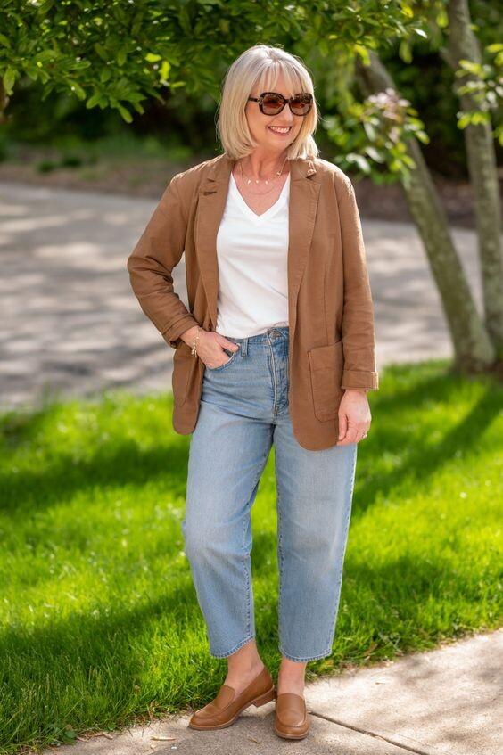 Простой, но в то же время элегантный наряд, в котором будет тепло и комфортно женщине 60+. Низ: укороченные светлые джинсы, не облегающие ноги, светло-коричневые туфли на плоском ходу. Верх: белая майка или футболка, кожаный пиджак в тон к туфлям. Завершить образ можно с помощью аксессуаров, в том числе очков.