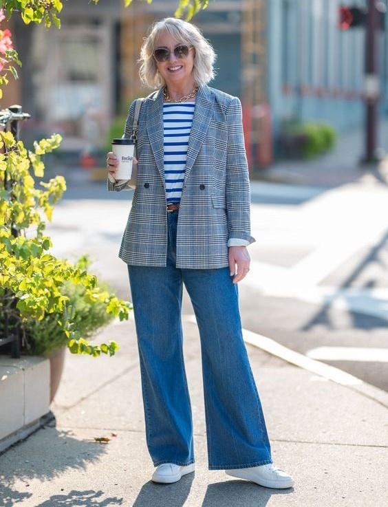 Комфортный многослойный образ на осень для женщины 60+ легко создать, используя серые прямые джинсы с эффектом состаривания, светлую кофточку с неглубоким V-образным вырезом и светлую рубашку в клетку (рукава можно подвернуть до локтей). Самой подходящей обувь будет спортивная: кеды, кроссовки, слипоны. Из аксессуаров подойдут браслеты и серьги-кольца.