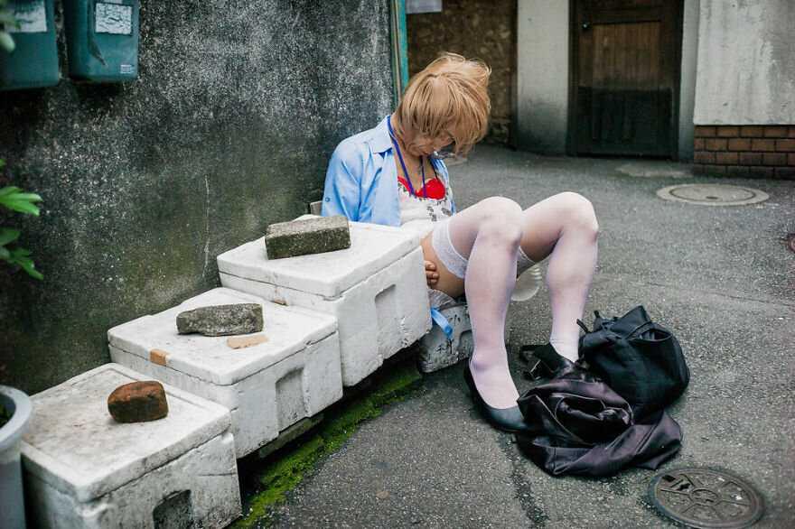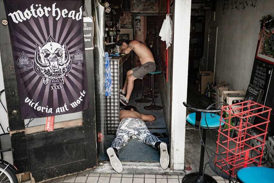 Фотографии были сделаны Ли Чэпменом, британским фотографом из Манчестера и основателем Tokyo Times, который приехал в Токио в 1998 году на «год или два» и, в общем, так и не уехал. Его откровенные кадры проливают свет на тот элемент жизни в этой стране, о котором мало кто думает, когда представляет себе японскую культуру. Мы привыкли к фотографиям красочных косплееров и неоновых чудес. Тем не менее, эти фотографии пьяных японцев, вырубившихся на улицах средь бела дня или дремлющих в горшках с растениями, знакомят нас с совершенно другим миром пьянства.