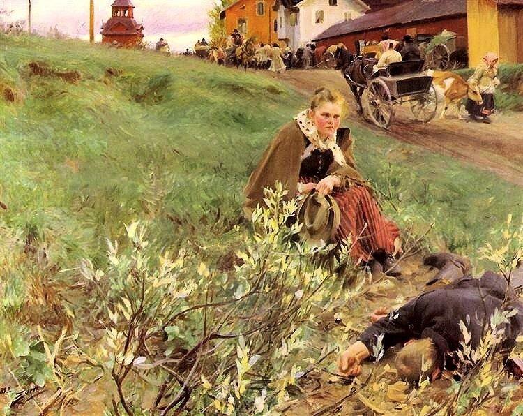 В своих изображениях крестьянской жизни Цорн переходил от традиционной жанровой живописи – например, от «Рынка в Мора» (1892), где раздраженная женщина, чей муж упал пьяным, ждет пока он придет в сознание, в то время как вся деревня проходит мимо них в праздничный базарный день, – к более натуралистичным, авангардным работам.