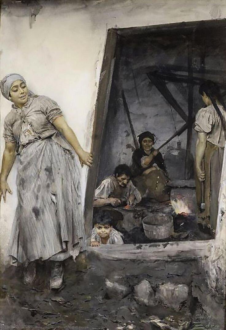 В «Цыганской кузнице» (1885), написанной в Румынии, крестьянская семья в открытом дверном проеме ярко освещена и находится в резком фокусе, а не романтически размыта.