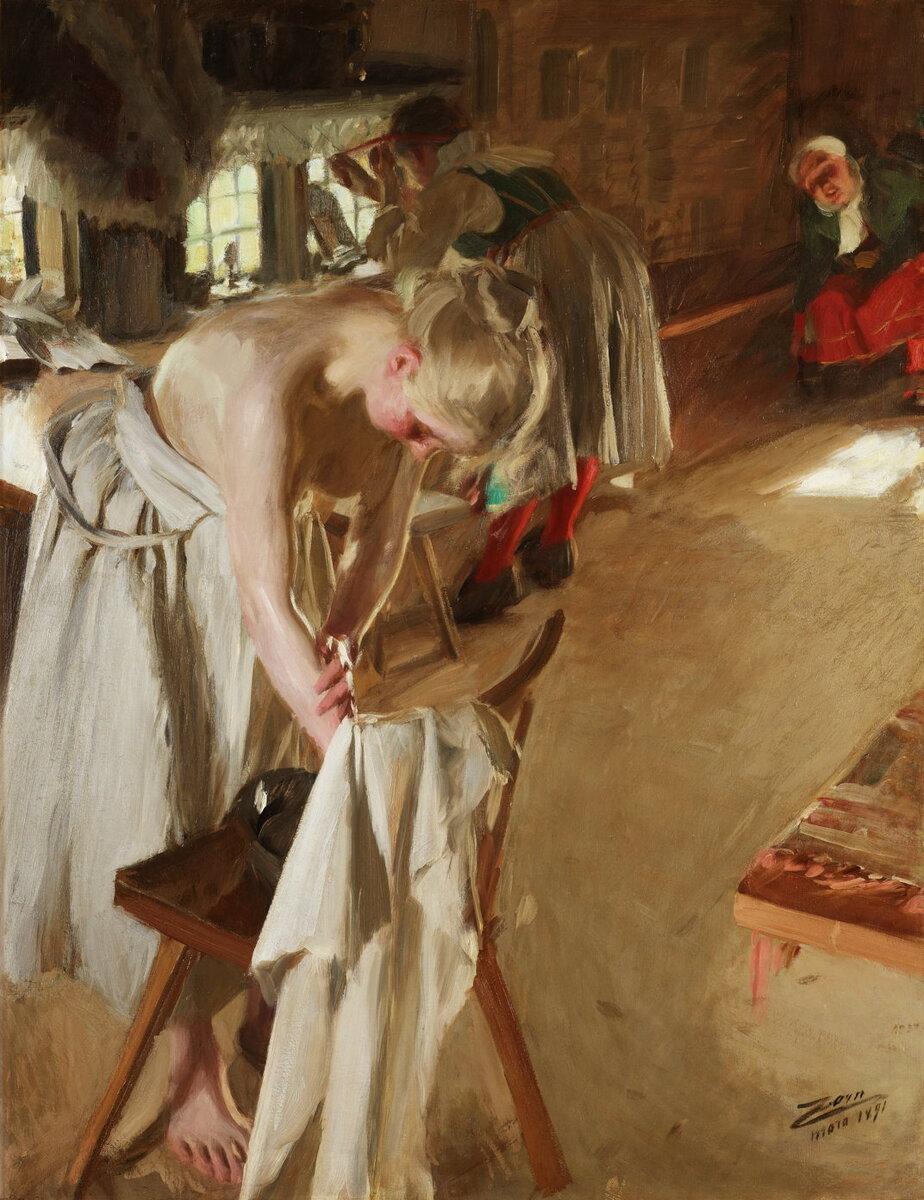 Цорн известен своими изображениями обнаженных женских фигур. Благодаря его свободному мазку, фигура женщины кажется растворяется в окружающей обстановке. Для своих картин с обнаженными женщинами Цорн выбирал моделей из тех, которые нуждались в дополнительном доходе – уборщиц, официанток, фабричных работниц, проституток, воровок.