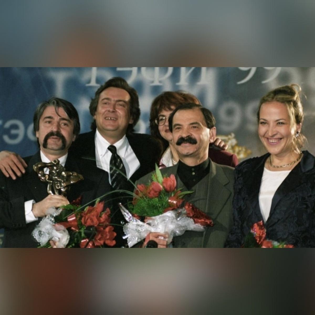 Торжественный момент вручения премии ТЭФИ-99 Юрию Стоянову и Илье Олейникову, звездам любимого многими юмористического шоу «Городок». Эти снимки противопоставляют культуру подполья и культуру главного эфира, подчеркивая многогранность эпохи.