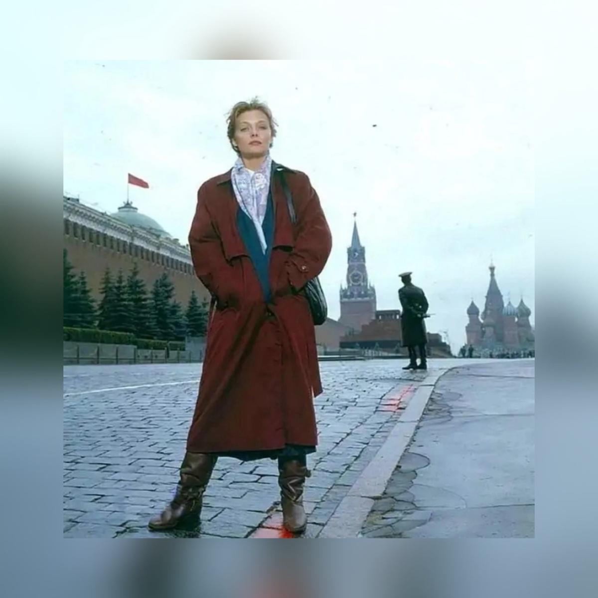 Контраст создают фотографии знаменитостей: Мишель Пфайфер на Красной площади в 1990 году – необычное сочетание голливудского гламура и советской реальности.