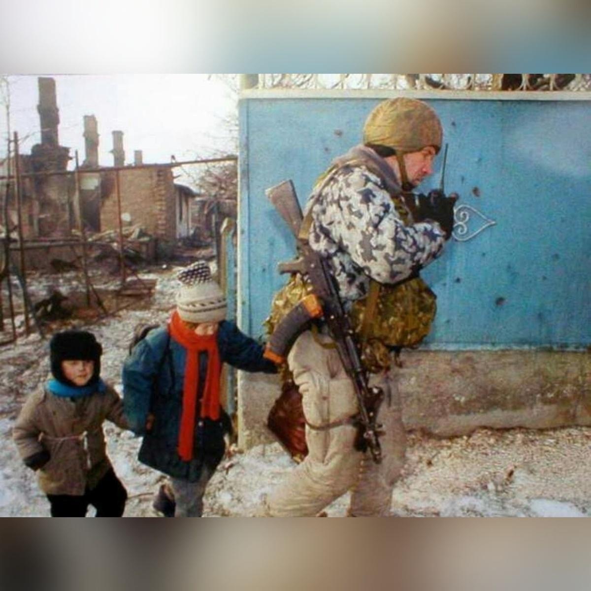 Боец ОМОНа ведёт детей к БТР — на фотографии, сделанной в Грозном в феврале 1995 года, запечатлён тяжелый момент военной истории России. Боец, проявляющий заботу о детях, показывает, что даже в самые трудные времена остаётся место для человечности.