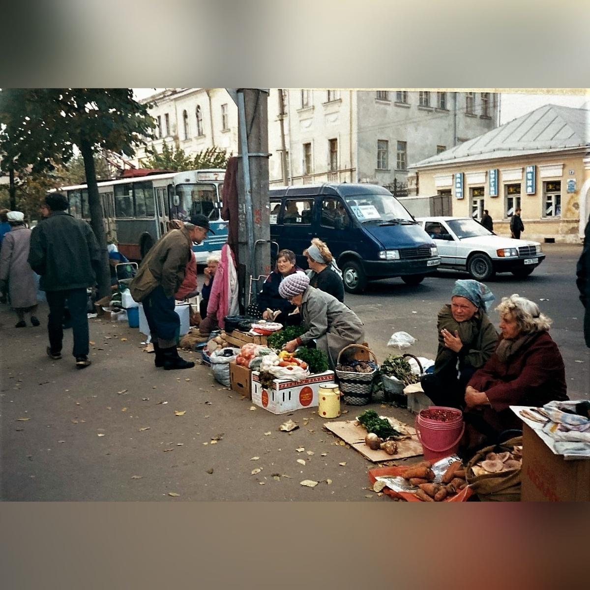 Бабушки на стихийном рынке Твери — этот кадр показывает, как пожилые женщины продавали свои товары на неофициальных рынках, что было распространённым явлением в 90-е.