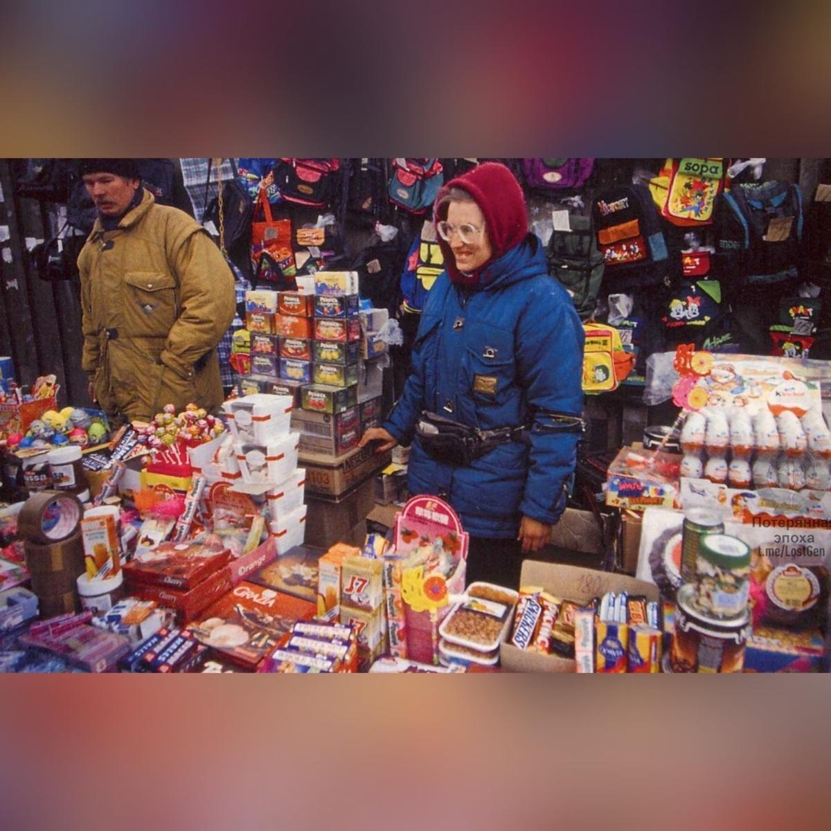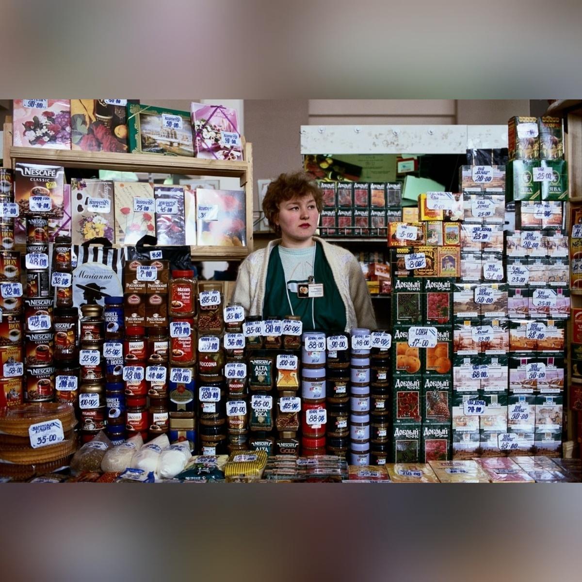 Продавец за прилавком — этот снимок показывает, как простые люди зарабатывали на жизнь в условиях переходного периода.