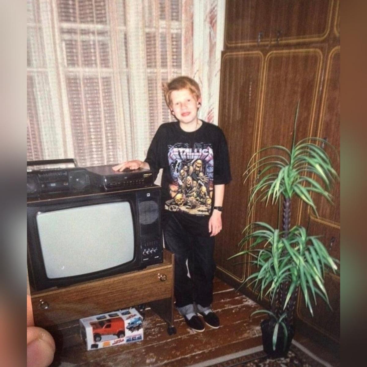 Маленький поклонник группы «Metallica» показывает новое оборудование.