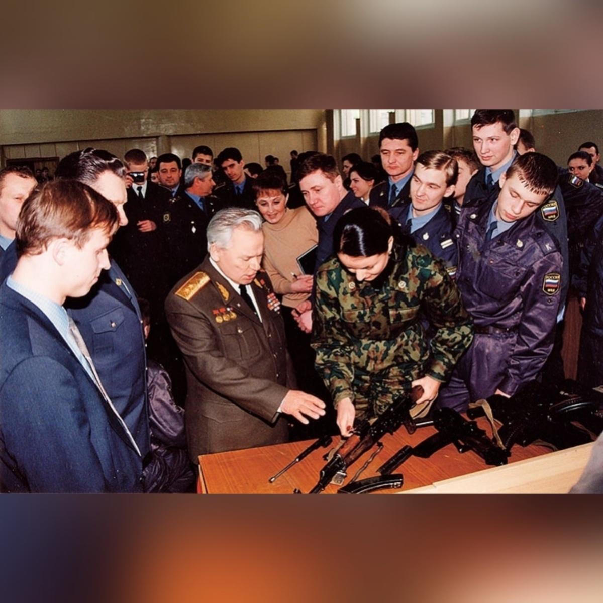 Будущая «Мисс Вселенная» Оксана Фёдорова на занятиях в Санкт-Петербургском университете МВД, где она собирает автомат под присмотром Михаила Калашникова в 1999 году.
