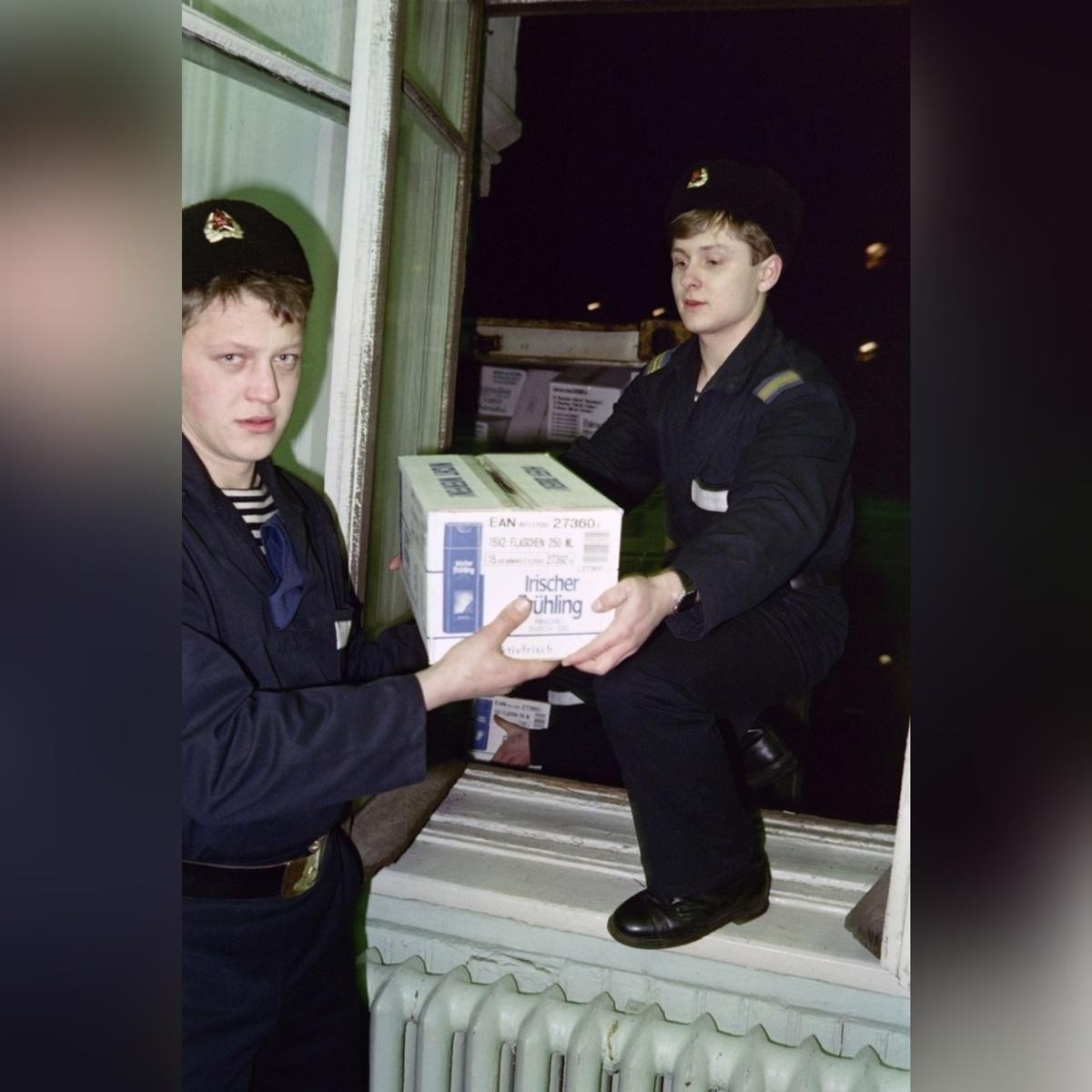 Моряки доставляют гуманитарную помощь, полученную от немецких благотворительных организаций, к домам москвичей. Событие датируется 11 декабря 1990 года.