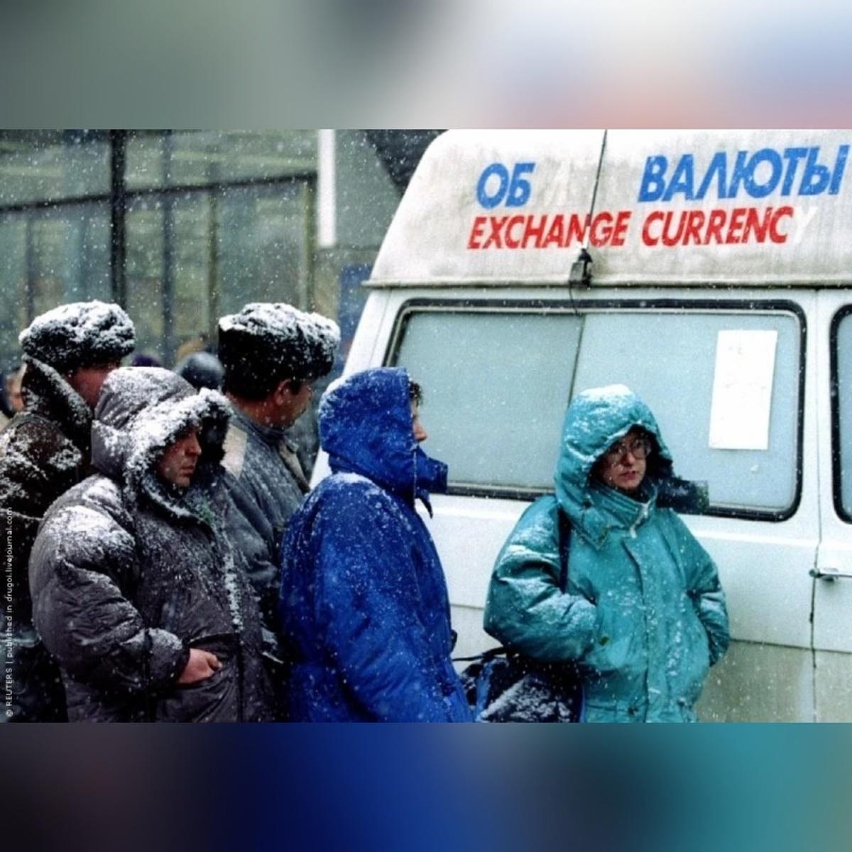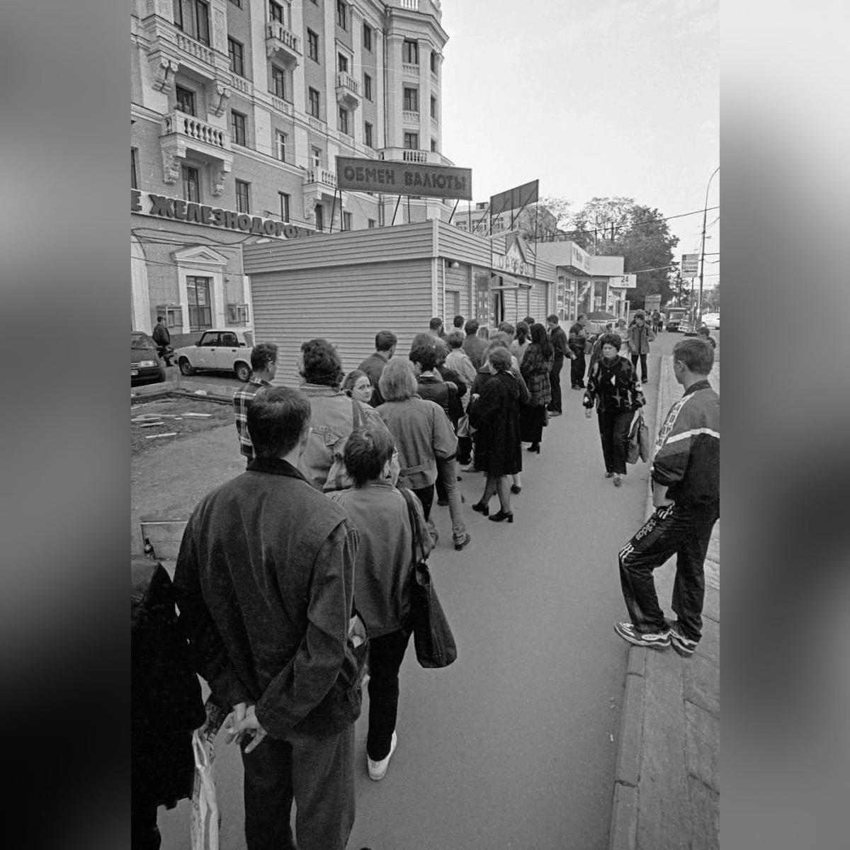 Фотография августовской очереди 1998 года у Белорусского вокзала за валютой напоминает о финансовых трудностях.