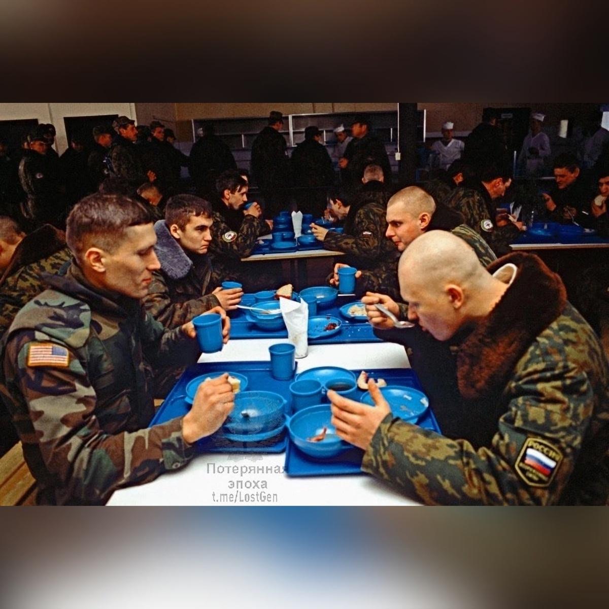 На фотографии из Боснии 1996 года мы видим российских и американских солдат в столовой – показатель международного сотрудничества и вмешательства в мировые конфликты.