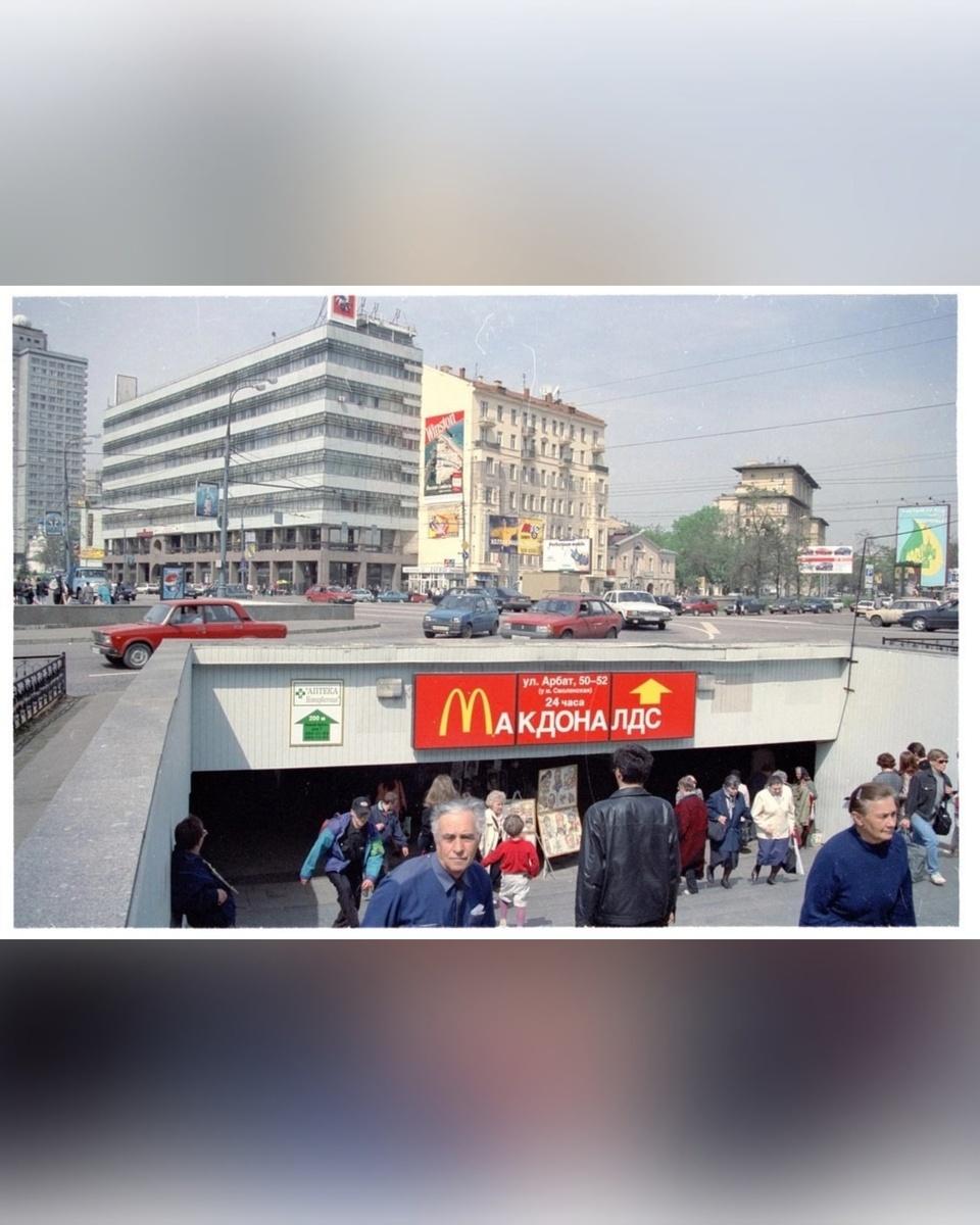 Фотография подземного перехода на Новом Арбате 1998 года, с рекламой Макдоналдса и шаржистами, демонстрирует влияние глобализации и появление новых форм рекламы.