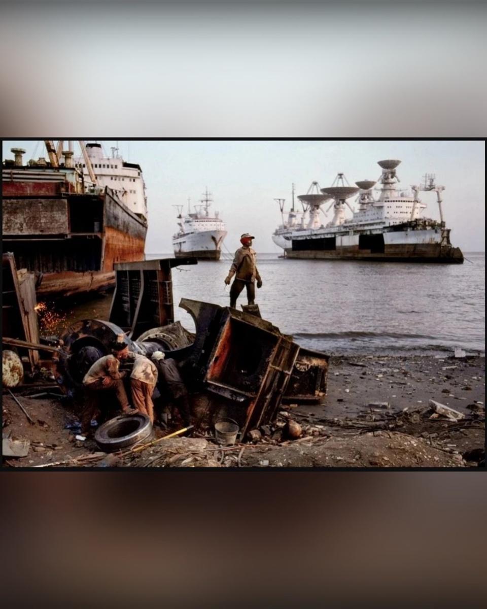Удручающее фото 1996 года из Аланга, Индия, показывает разборку на металлолом советских научных судов «Академик Сергей Королев» и «Космонавт Юрий Гагарин» – символ упадка советской науки.