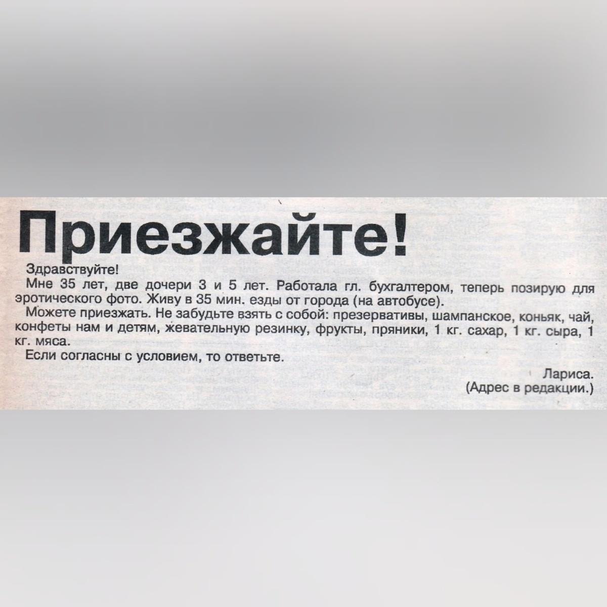 Это фрагмент газетного объявления из газеты «Двое» 1994 года – напоминает о специфике рекламной индустрии того времени, о способах поиска информации и общения.