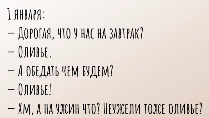 — Уже скоро Новый год, режь скорее овощи на оливье, я пошел за игристым!