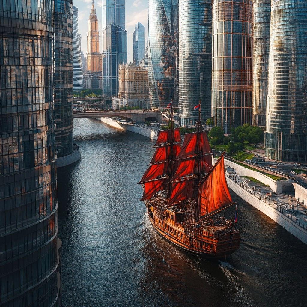 А здесь мы видим, как проходили бы питерские «Алые Паруса» в российском Нью-Йорке. Среди стеклянных небоскребов тоже очень красиво!