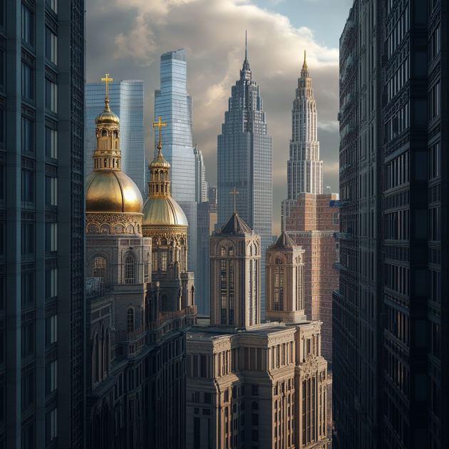Ну и моё самое любимое – купола на вершинах небоскребов. Можно подумать, что ИИ сошел с ума, но ведь выглядит очень даже красиво!