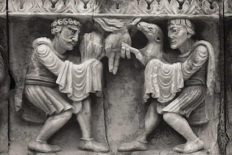 Иногда Каин убивает брата небольшим камнем, иногда уже целой каменной плитой. Художники избегают изображения мечей и ножей. И это совершенно верно, так как металлических орудий тогда еще не изобрели. Первым на свете кузнецом принято считать человека по имени Тувалкаин (потомок Каина в 6 колене).