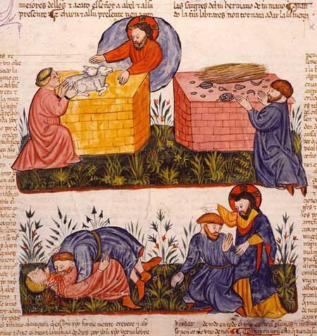 «Спустя несколько времени, Каин принес от плодов земли дар Господу, и Авель также принес от первородных стада своего и от тука их. И призрел Господь на Авеля и на дар его, а на Каина и на дар его не призрел».