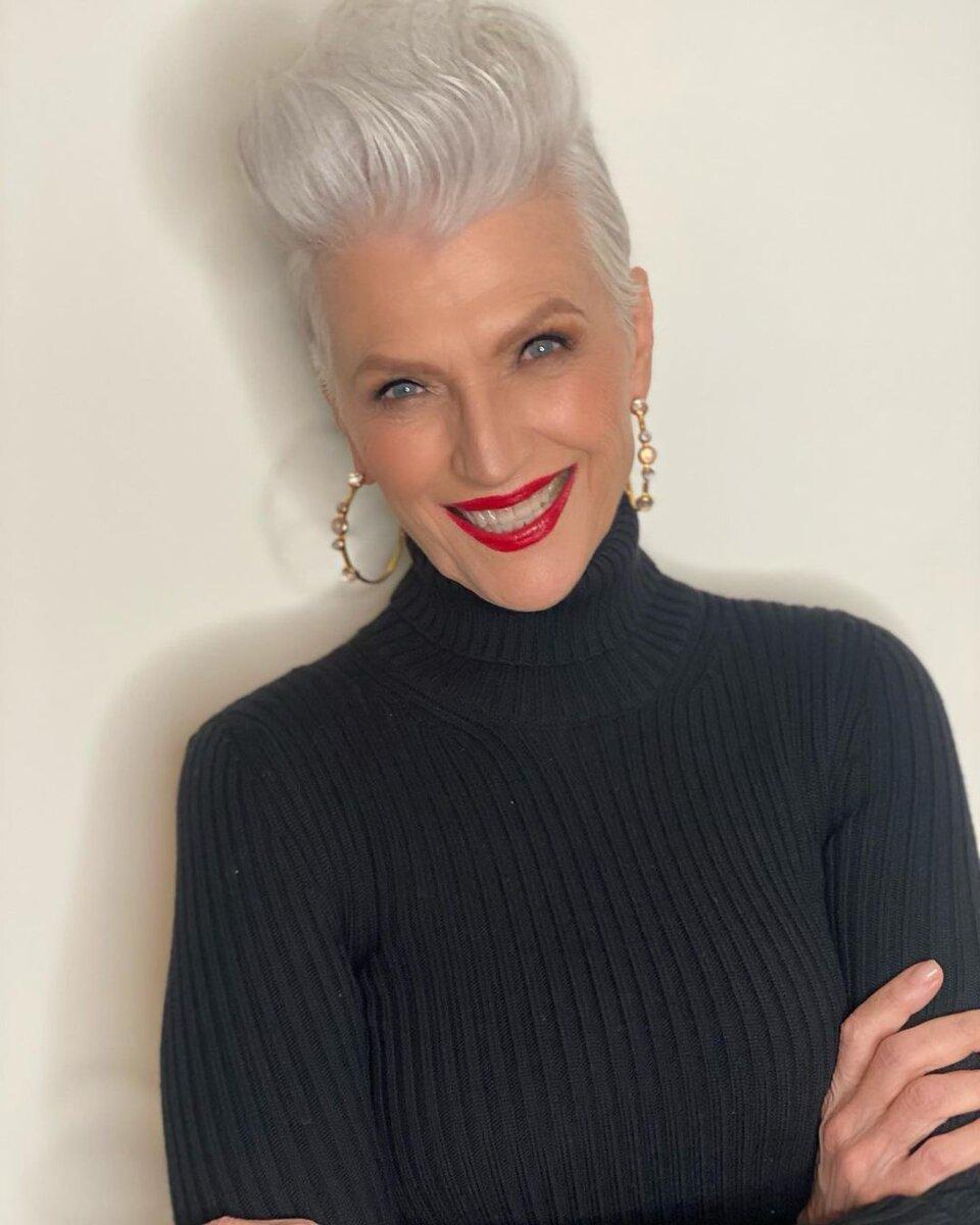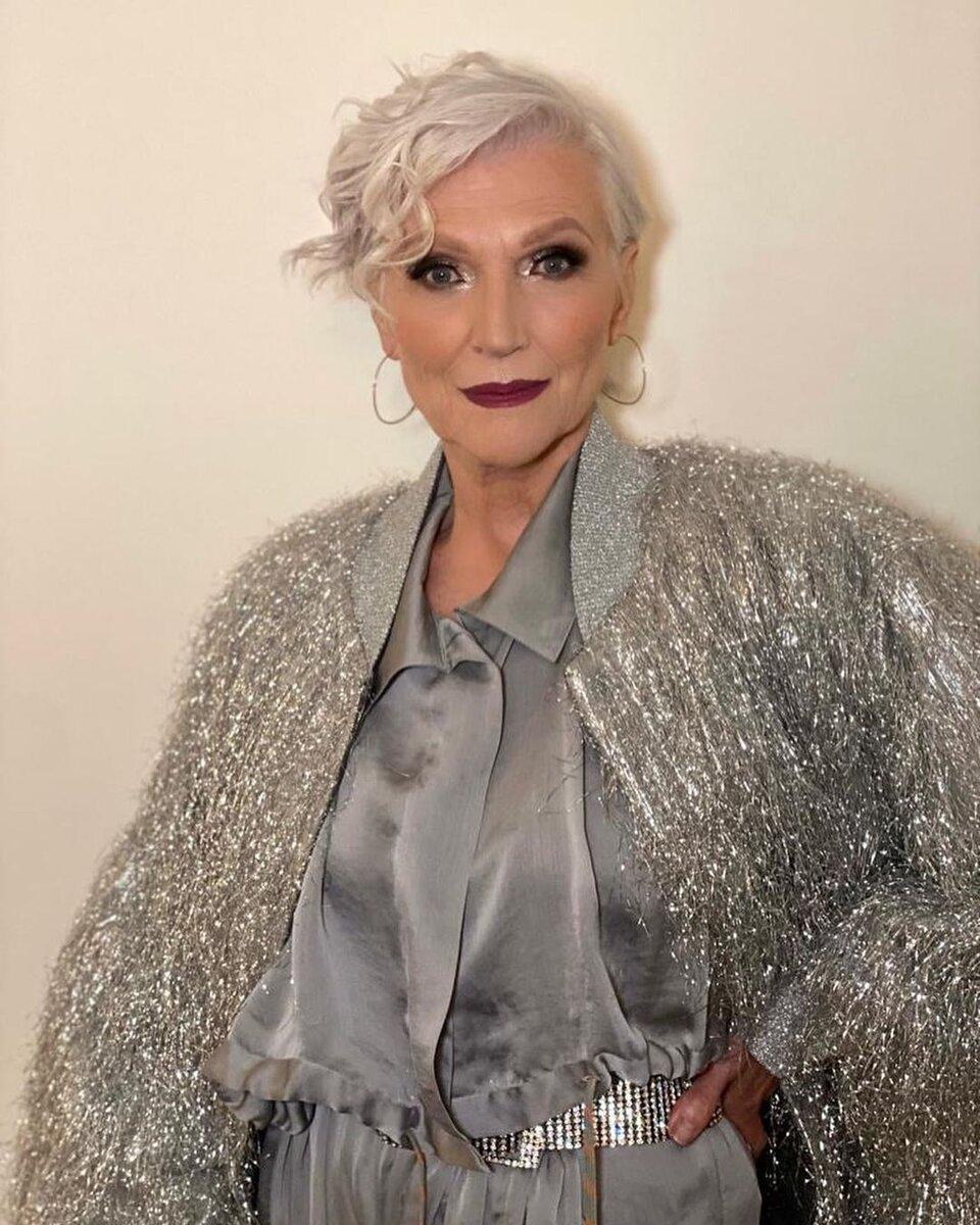 Госпожа Маск стала популярной именно в зрелом возрасте, поэтому он — её главная фишка. Мэй перестала красить волосы в 60 лет и сейчас у нее естественная седина. А яркому макияжу она предпочитает акцент на губы, ведь это экономит время и выглядит более натурально.