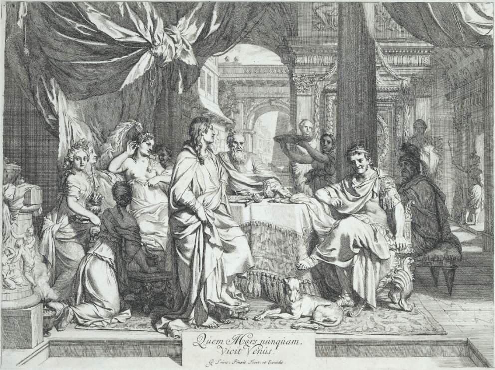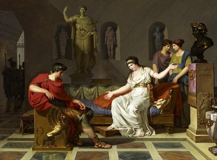 …Когда посланные подбежали ко дворцу и, застав караульных в полном неведении, взломали двери, Клеопатра в царском уборе лежала на золотом ложе мертвой. Одна из двух женщин, Ирада, умирала у её ног, другая, Хармион, уже шатаясь и уронив голову на грудь, поправляла диадему в волосах своей госпожи. Кто-то в ярости воскликнул: «Прекрасно, Хармион!» — «Да, поистине прекрасно и достойно преемницы стольких царей», — вымолвила женщина и, не проронив больше ни звука, упала подле ложа (Плутарх).