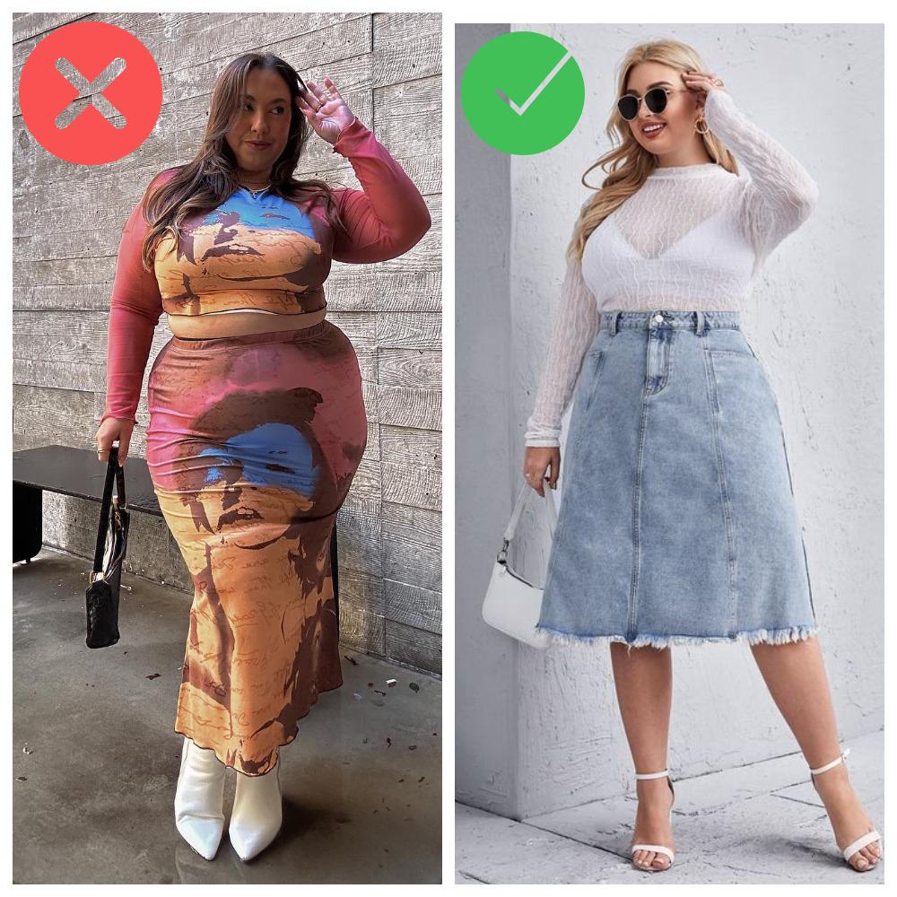 Между однотонной и принтованной вещью пышке стоит выбрать второе. А всё потому, что моно-цвет сразу выделяет лишние килограммы.