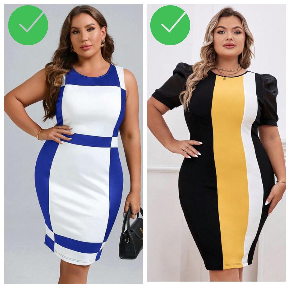 Этот цветовой приём часто используется производителями платьев для женщин plus size. Суть в том, чтобы визуально сформировать новый, более стройный силуэт за счёт разноцветных блоков.