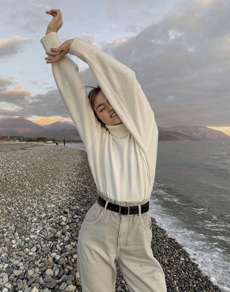 Тебе идеально подходят светлые пастельные тона — бежевый, лососевый, персиковый, сливочный, серый и другие. Есть два материала, которые идеально сочетаются с твоим образом: плотный и мягкий (а-ля уютный спортивный костюм или объёмный свитер oversize), а также струящийся и невесомый (хлопковая блузка или шёлковое платье).