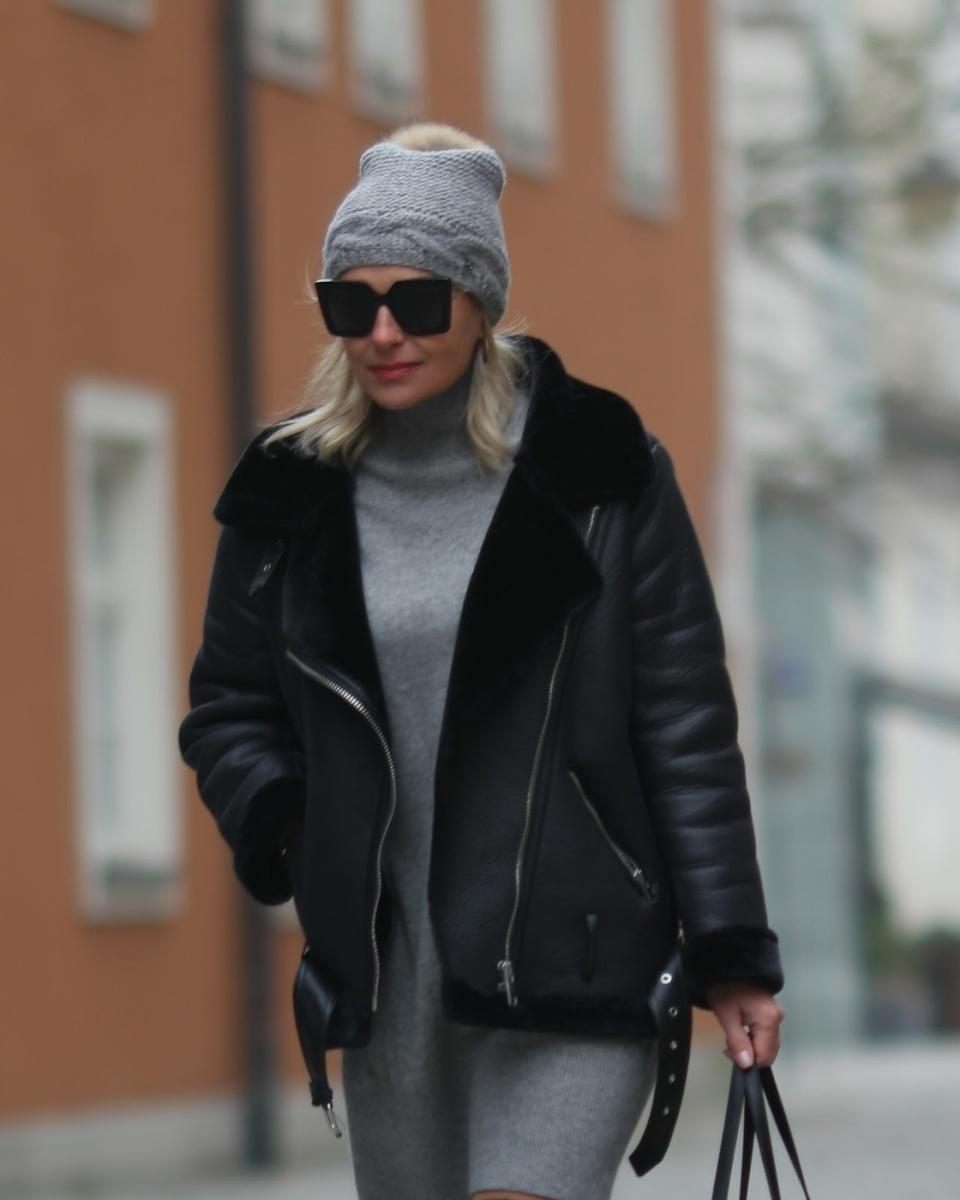 Следующее правило — выбрать подходящую вязку. Слишком крупная и объёмная сейчас неактуальны, поэтому советую присмотреться к шапкам в рубчик, либо к полотну с мелкими петлями, но из тёплой пряжи. Чаще всего на таких моделях нет широкого отворота, благодаря чему их можно сочетать с элегантным пальто или шубой. Вот примеры.