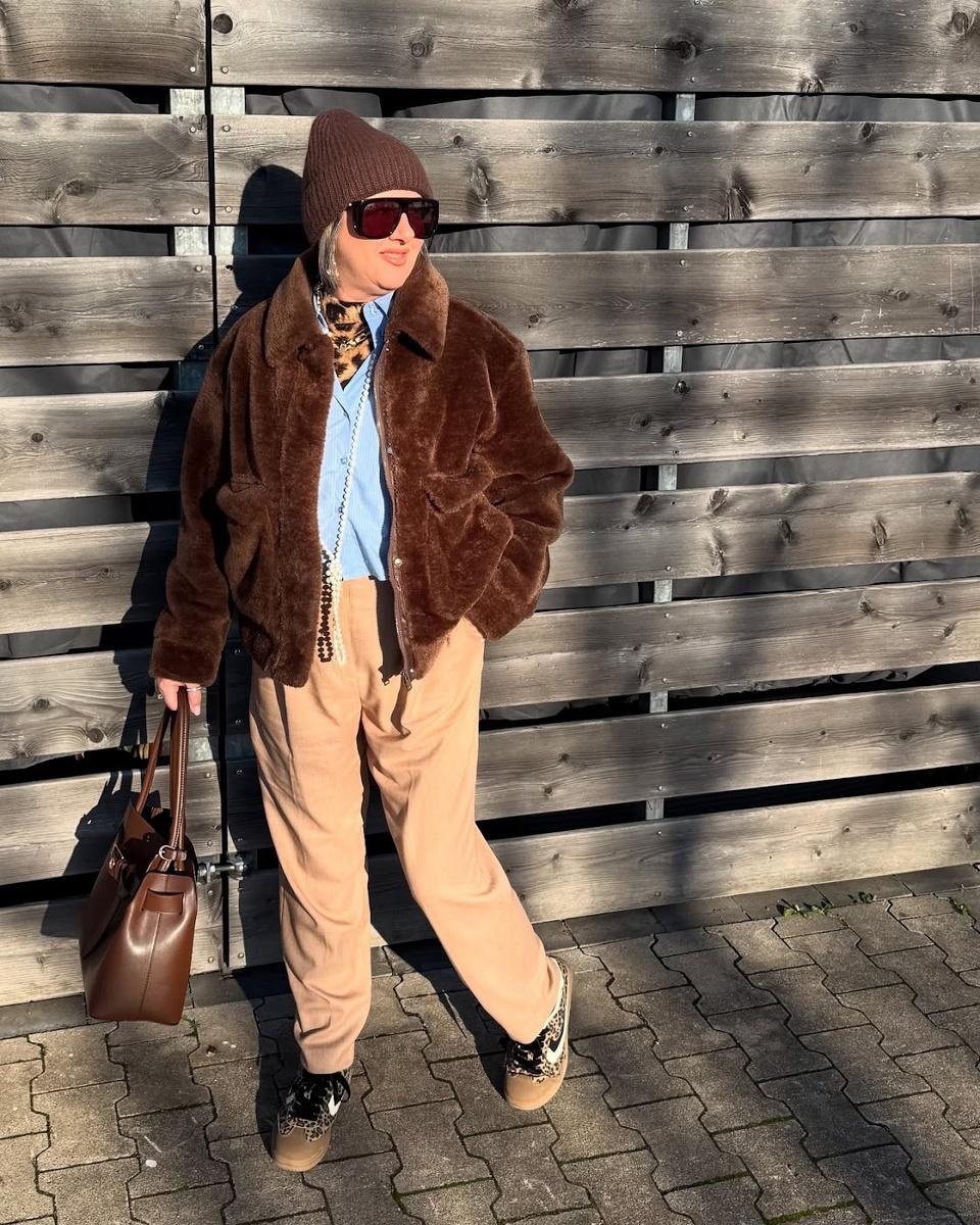 А вот даме 50+ нужно по максимуму внедрять в гардероб спортивные элементы. Например, кеды, бейсболку, свободные джинсы и, конечно же, бини.