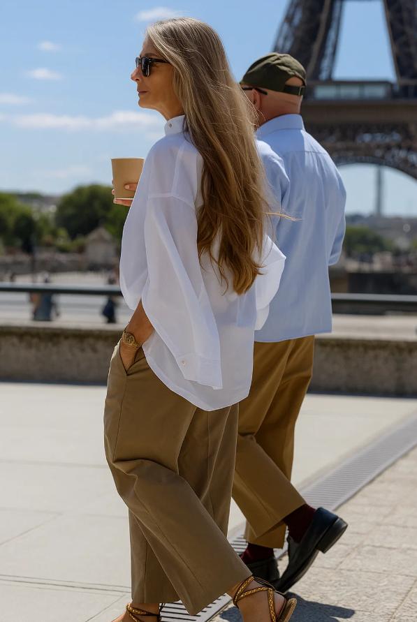 Сколько раз я видела, как прекрасная женщина «прячет» свою фигуру, отпуская всё поверх брюк. Стоп! Лёгкая заправка — пусть даже наискосок, только спереди — даёт силуэту новую геометрию. Это подчёркивает талию и делает весь образ более свежим. Да, даже если есть животик. Мы не прячем себя — мы украшаем.