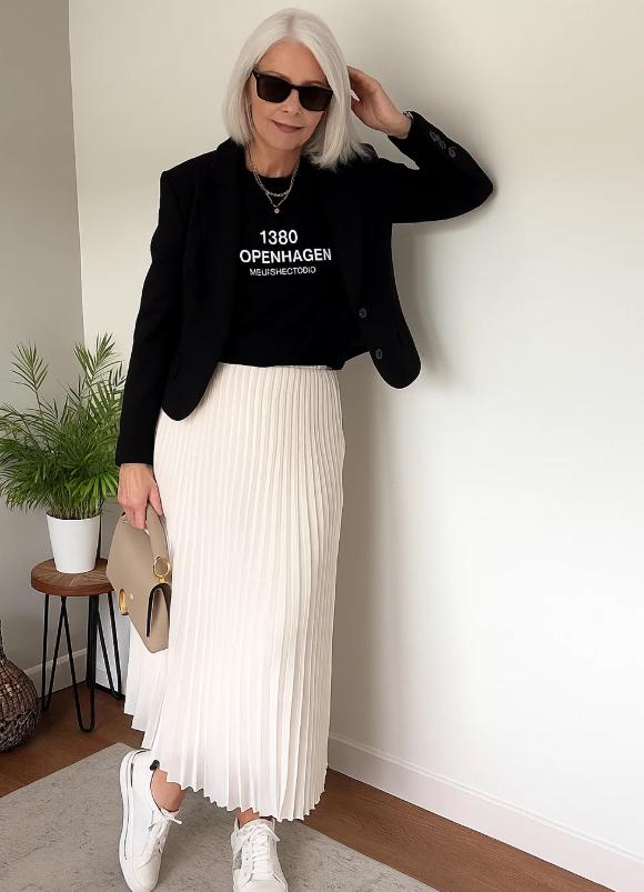 1. Чёрный укороченный жакет, футболка с надписью и воздушная плиссированная юбка молочного оттенка — это уже классика современного базового гардероба. А белые кеды, крупные тёмные очки и клатч делают образ лёгким, актуальным и чуть дерзким. Тут нет случайных деталей — всё продумано до сантиметра, но при этом создаётся ощущение, будто она просто так вышла из дома. И это высший пилотаж в стиле.