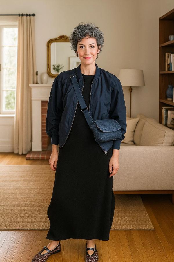 2. Второй образ буквально создан из базовых вещей! Чёрное платье прямого кроя — идеальная база на каждый день. Оно не привязано ни к сезону, ни к настроению — его можно стилизовать бесконечно. Поверх — объёмный тёмно-синий бомбер, который добавляет структуру и немного дерзости. И сумка через плечо — очень правильный выбор. Без глянца, практичная, с акцентом на функциональность. И всё это завершают балетки с ремешком в сетку.