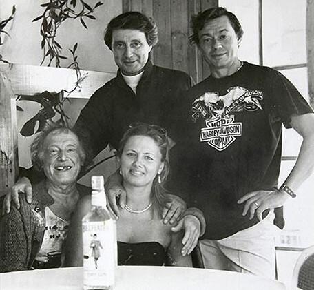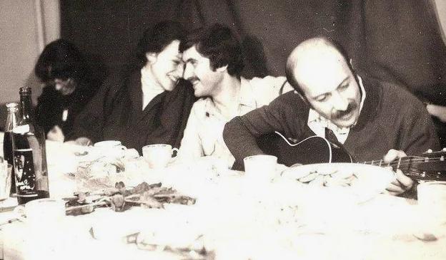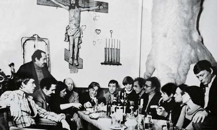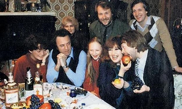на заднем плане Владимир Высоцкий с Мариной Влади. По центру его друг Всеволод Абдулов с женой Юлией. Рядом с Мариной Влади Станислав Говорухин. Во втором ряду Бэлла Ахмадулина и Василий Аксенов.