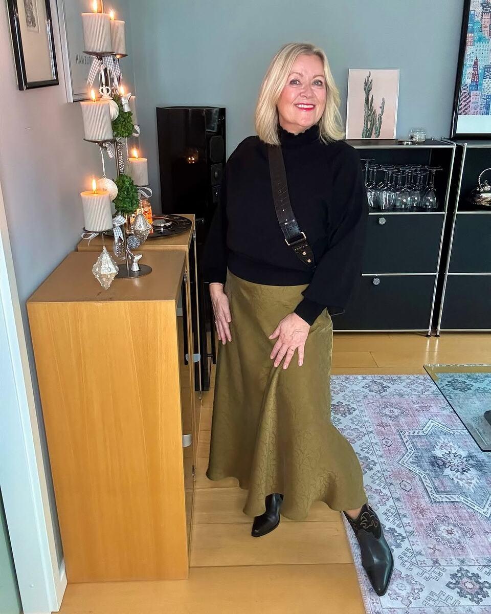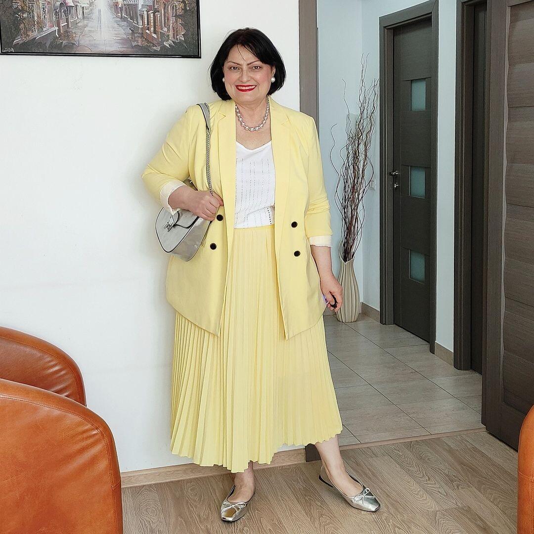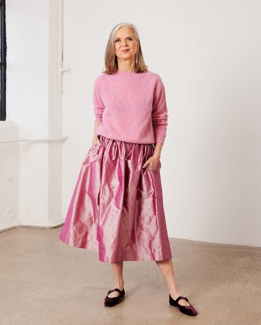 Как это работает: Выбирайте юбки и блузы из шелка, вискозы, тонкого трикотажа. Обратите внимание на А-силуэты, платья-рубашки, юбки миди с легкой драпировкой. Эти фасоны добавляют легкости и динамики, делая образ визуально более свежим.