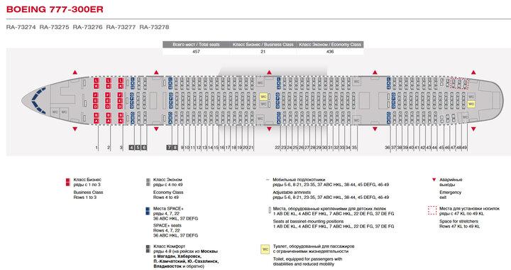 Мы летели на борту Boeing 777-300ER с компоновкой кресел 3-4-3. Но в хвосте самолёта есть несколько рядов в двойными сиденьями, как раз там мы и летели – на двойных местах в 47 ряду туда и 45 ряду обратно.