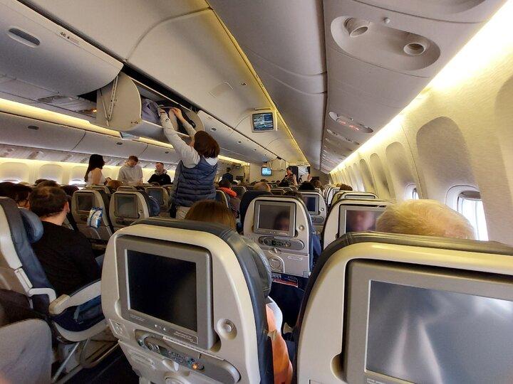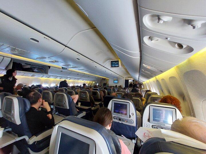 Борт был абсолютно полный. Чтобы размять ноги, пару раз ходили по салону, делали гимнастику.