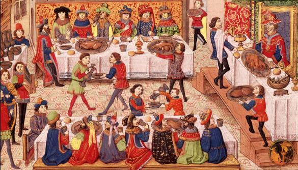 Конечно же, по случаю празднеств накрывались пышные столы. Богатые жители наслаждались разнообразной пищей: они употребляли мясо, рыбу, фрукты и овощи, а также часто на столах присутствовали и экзотические блюда: например, сладости (кстати, с фруктами дела обстояли сложно: на севере ассортимент был ограничен яблоками, грушами, сливами и земляникой. На юге были известны лимоны, апельсины, гранаты и виноград , но такие яства были доступны лишь немногим).