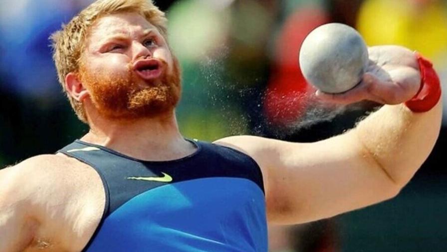 А этот рыжеволосый бородатый богатырь запечатлён перед самым отрывом ядра от руки. То есть в тот момент, когда лицо испытывает самое сильное давление центробежных сил.