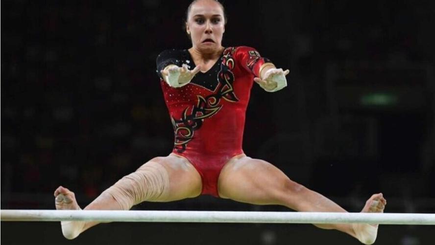 Невольно создаётся впечатление, что гимнастка в красно-чёрном тренировочном костюме просто не успела вовремя поймать перекладину. А потому прямо сейчас отправляется в неконтролируемый полёт как минимум в стратосферу.