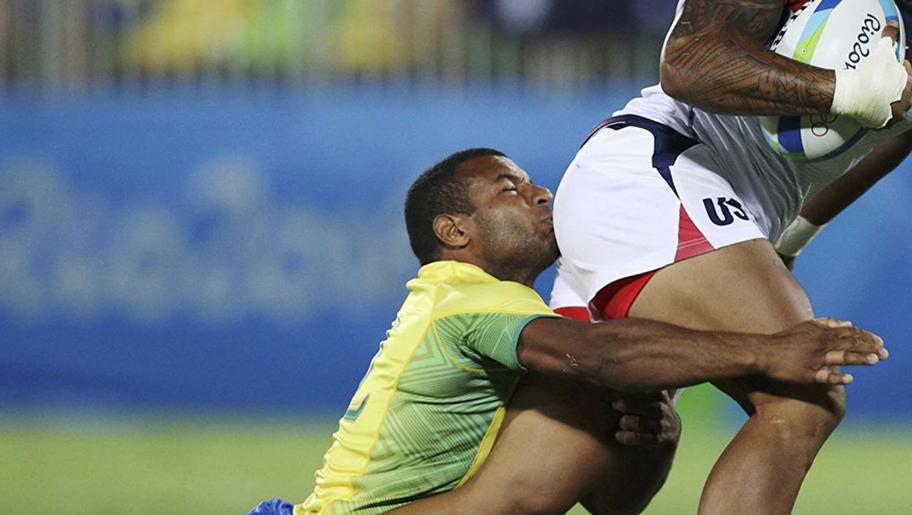 Теперь в фокусе фотографа — драматичный момент из регби. На этот раз чернокожий игрок не успевает справиться с противником в белой форме. А потому только и делает, что дарит на прощание особый «ускользающий поцелуй».