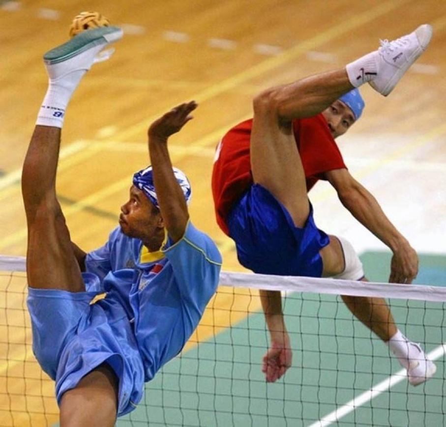 Перед вами – теннис ногами. Да-да — что-то типа теннисного поединка, где нет ракеток, а есть только возможность красиво пинать небольшой мяч. Но в этом кадре кажется, что будто бы два средневековых ниндзя вызвали друг друга на поединок. И теперь решают, чьё ниндзюцу всё-таки лучше.
