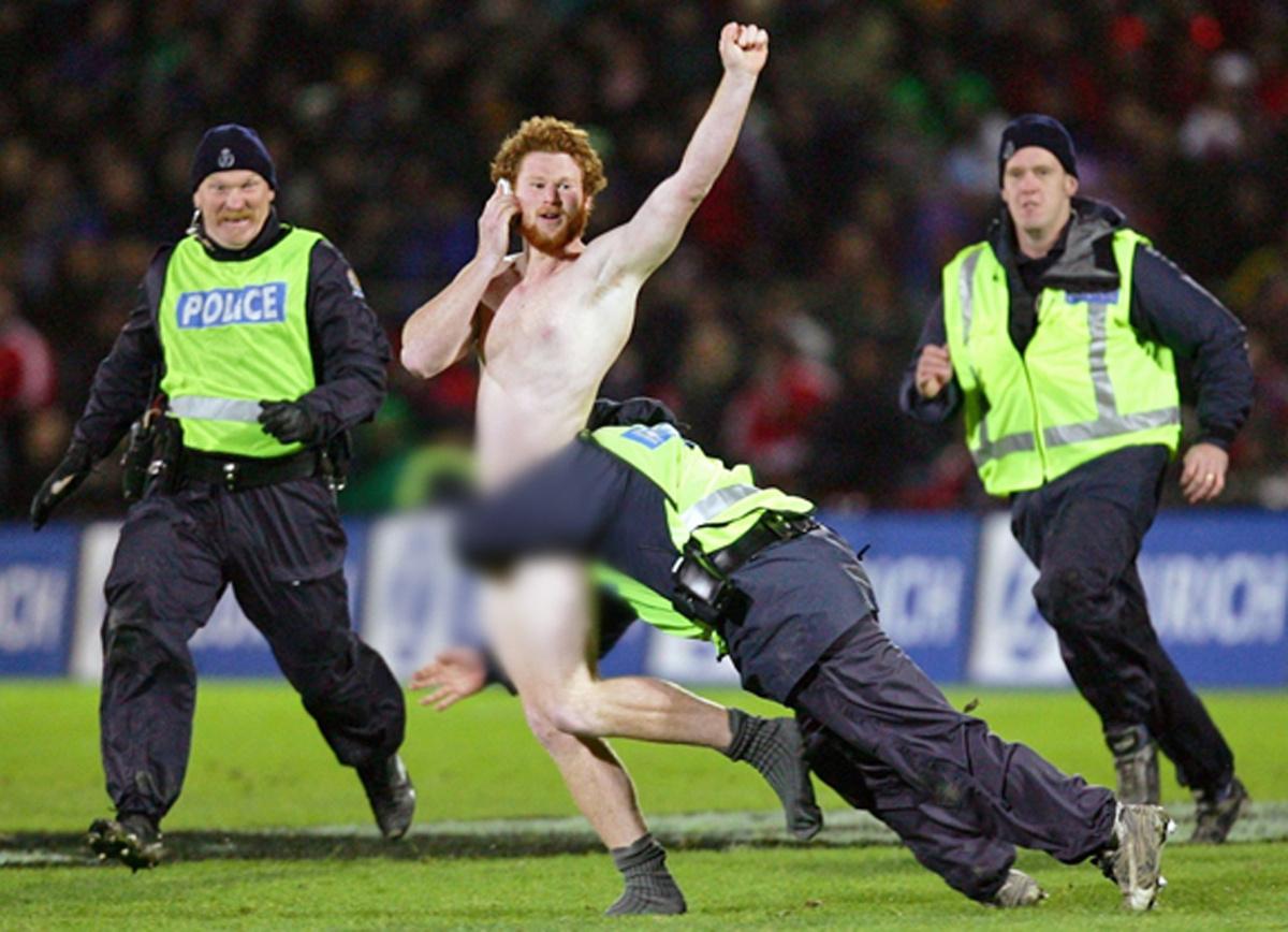 Существует крайне распространённое явление, когда во время важного матча, ради озорства, болельщик или болельщица (часто сильно «перебравши») устремляется на поле для всеобщей демонстрации своей удали и наготы.