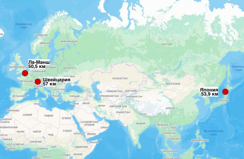 Длиннее Ла-Манша только японский тоннель Сэйкан длинной 53,9 км и Готардский базисный тоннель в Швейцарии (57 км):