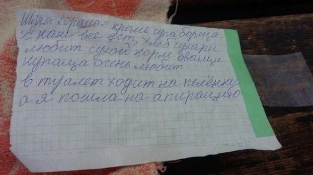 «Шуня хорошая. Кроме супа, борща и каш, всё ест. Хлеб, сухари, любит сухой корм, овощи, купаться очень любит. В туалет ходит на пелёнку, а я пошла на операцию.» — говорилось в записке. Вероятнее всего, этот текст написала хозяйка Шуни — пожилая женщина. Скорее всего, у старушки просто не было дргих вариантов, куда деть собачку, и она решилась на такой шаг от безысходности.