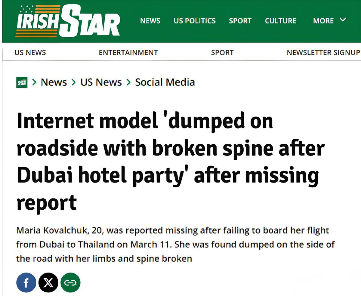 В марте 2025 года в Дубае случилась трагедия, которая вскоре стала достоянием соцсетей и новостных площадок. 20-летнюю украинку Марию Ковальчук обнаружили без сознания прямо на обочине трассы.