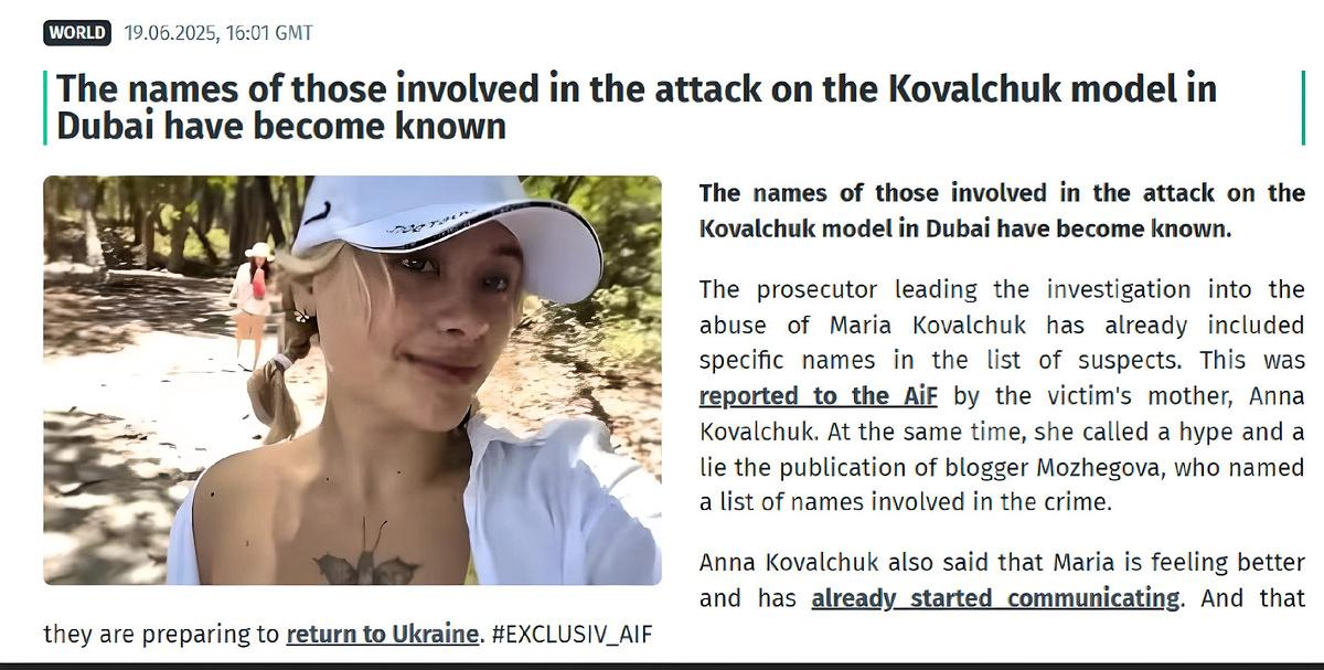 Западные СМИ продолжают освещать историю украинской модели Марии Ковальчук, которая после длительного лечения в Эмиратах была экстренно вывезена на родину. Среди англоязычных изданий особое внимание к делу проявили People, New York Post и The Sun, каждая из которых озвучила собственную версию событий, местами перекликаясь, а местами вступая в прямое противоречие.