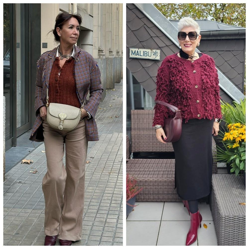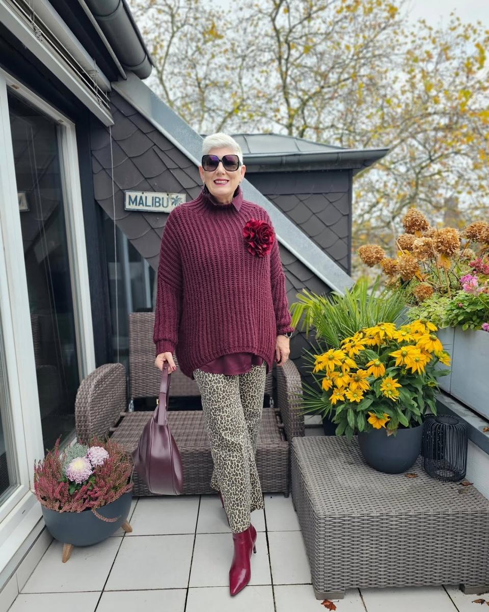 Посмотрите на фото ниже. Там дама собрала в образе сразу несколько ошибок, из-за которых стала выглядеть на несколько лет старше. Бесформенный свитер, крупная вязка, глубокий бордовый цвет и вуаля!